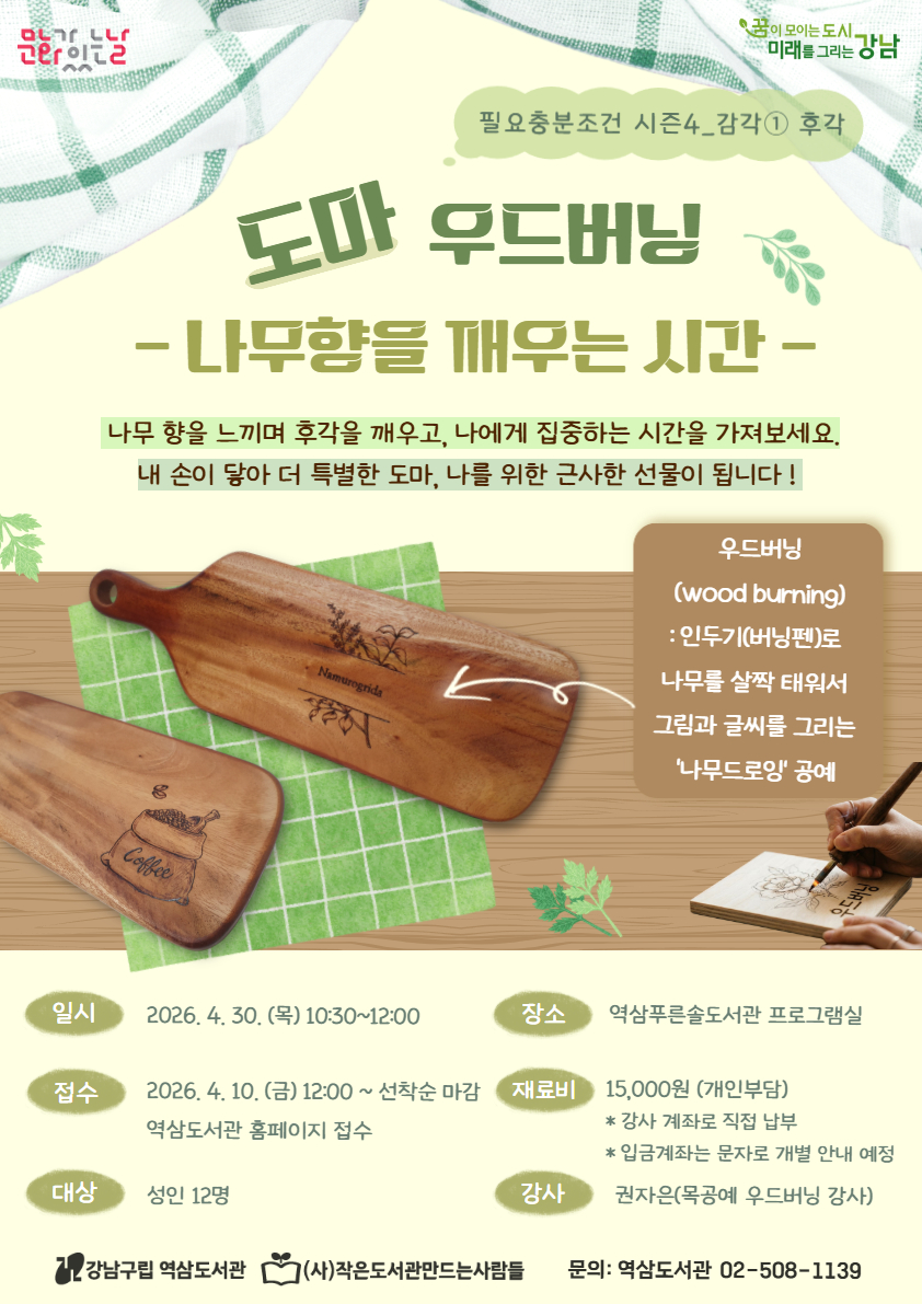 | 행사명 | 역삼 [성인-대면][문화가있는날] 필요충분조건 시즌4_감각① 후각 "도마 우드버닝: 나무향을 깨우는 시간" |