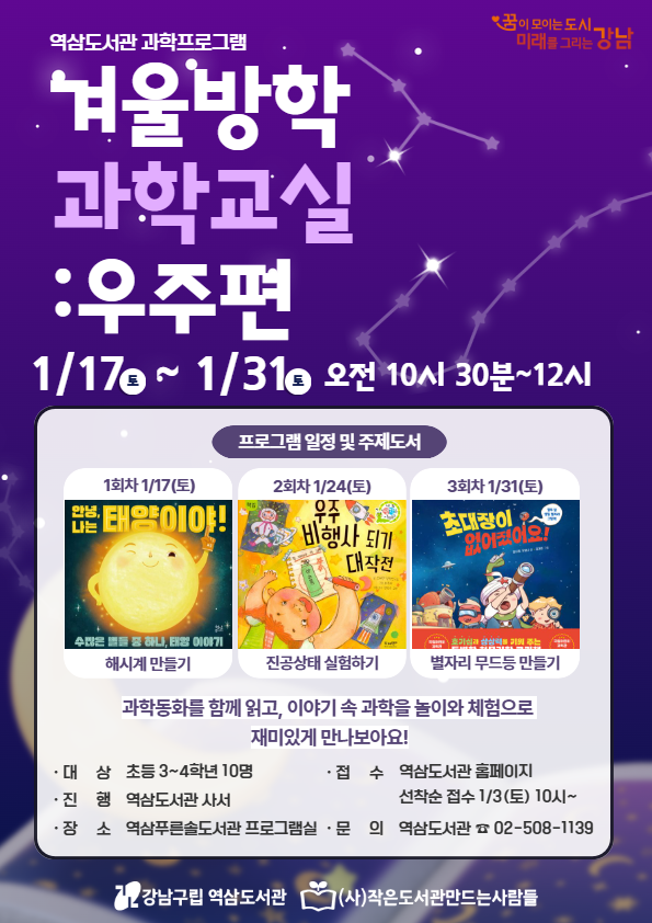 | 행사명 | 역삼 [초등-대면] 겨울방학 과학교실: 우주편 |