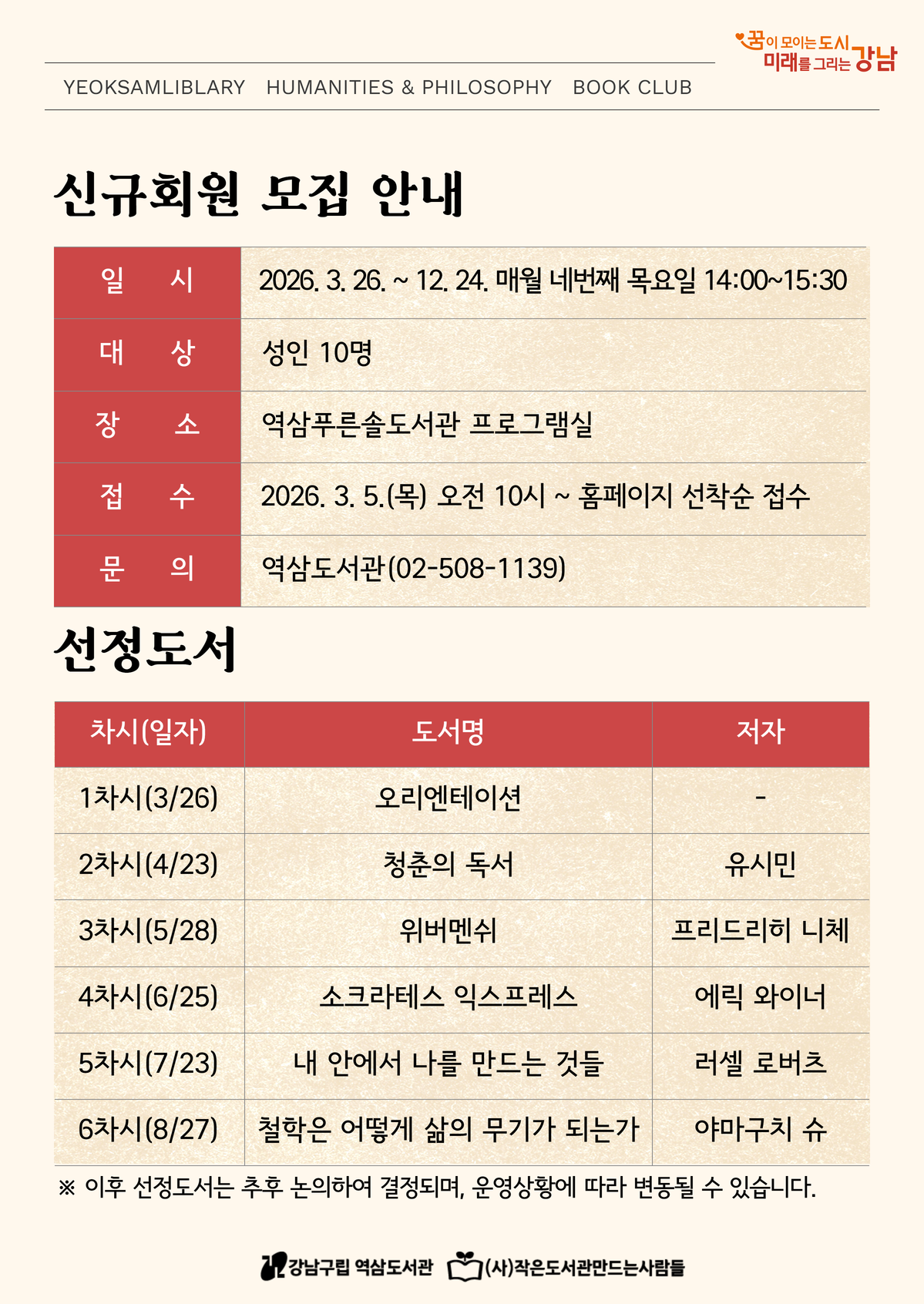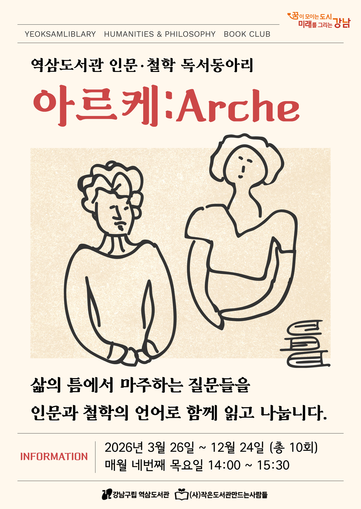 1. 추후 일정 및 토론 도서의 변동이 있을 수 있습니다. 2. 접수 완료 후 문자 메시지로 수업 진행을 공지해 드리오니 휴대전화번호를 꼭 확인해 주세요. 3. [아르케]는 독서동아리로 총 10회 진행됩니다. 4. 진행 일시 : 3/26, 4/23, 5/28, 6/25, 7/23, 8/27, 9/24(변동가능), 10/22, 11/26, 12/24 ![]() ![]() ![]() |