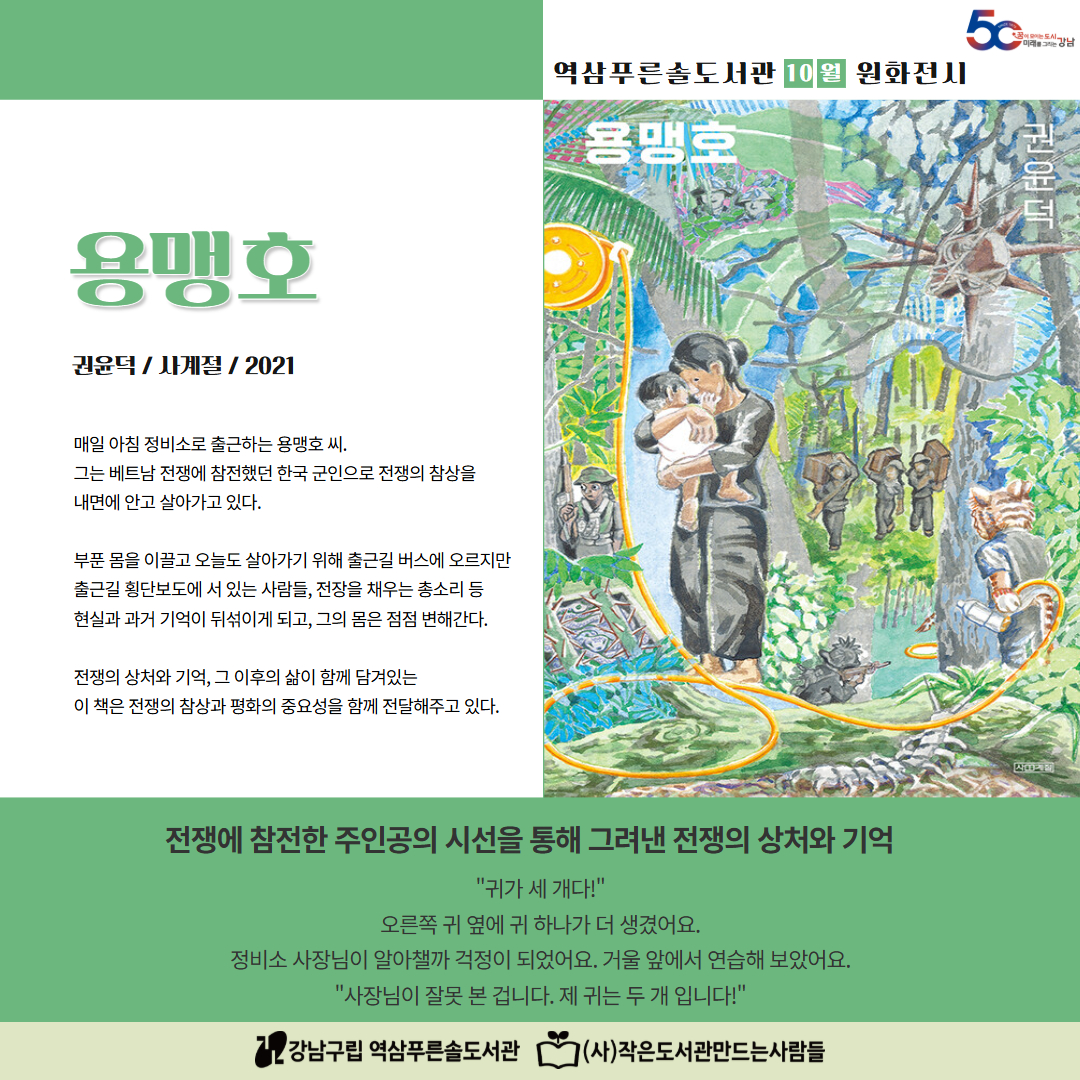 용맹호 권윤덕 / 사계절 / 2021 매일 아침 정비소로 출근하는 용맹호 씨. 그는 베트남 전쟁에 참전했던 한국 군인으로 전쟁의 참상을 내면에 안고 살아가고 있다. 부푼 몸을 이끌고 오늘도 살아가기 위해 출근길 버스에 오르지만 출근길 횡단보도에 서 있는 사람들, 전장을 채우는 총소리 등 현실과 과거 기억이 뒤섞이게 되고, 그의 몸은 점점 변해간다. 전쟁의 상처와 기억, 그 이후의 삶이 함께 담겨있는 이 책은 전쟁의 참상과 평화의 중요성을 함께 전달해주고 있다. "귀가 세 개다!" 오른쪽 귀 옆에 귀 하나가 더 생겼어요. 정비소 사장님이 알아챌까 걱정이 되었어요. 거울 앞에서 연습해 보았어요. "사장님이 잘못 본 겁니다. 제 귀는 두 개 입니다!" |