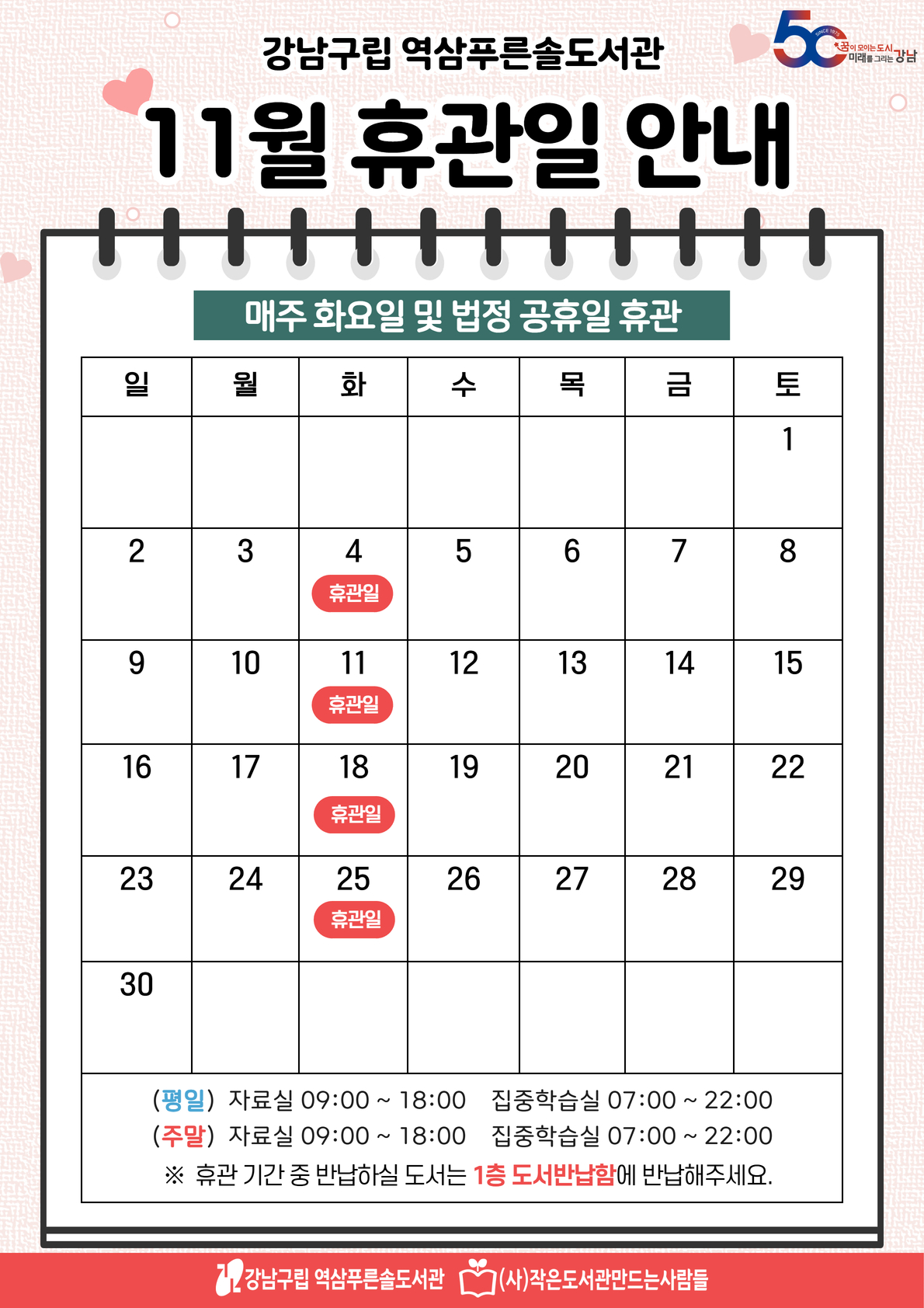 [역삼푸른솔도서관] 11월 휴관일 안내