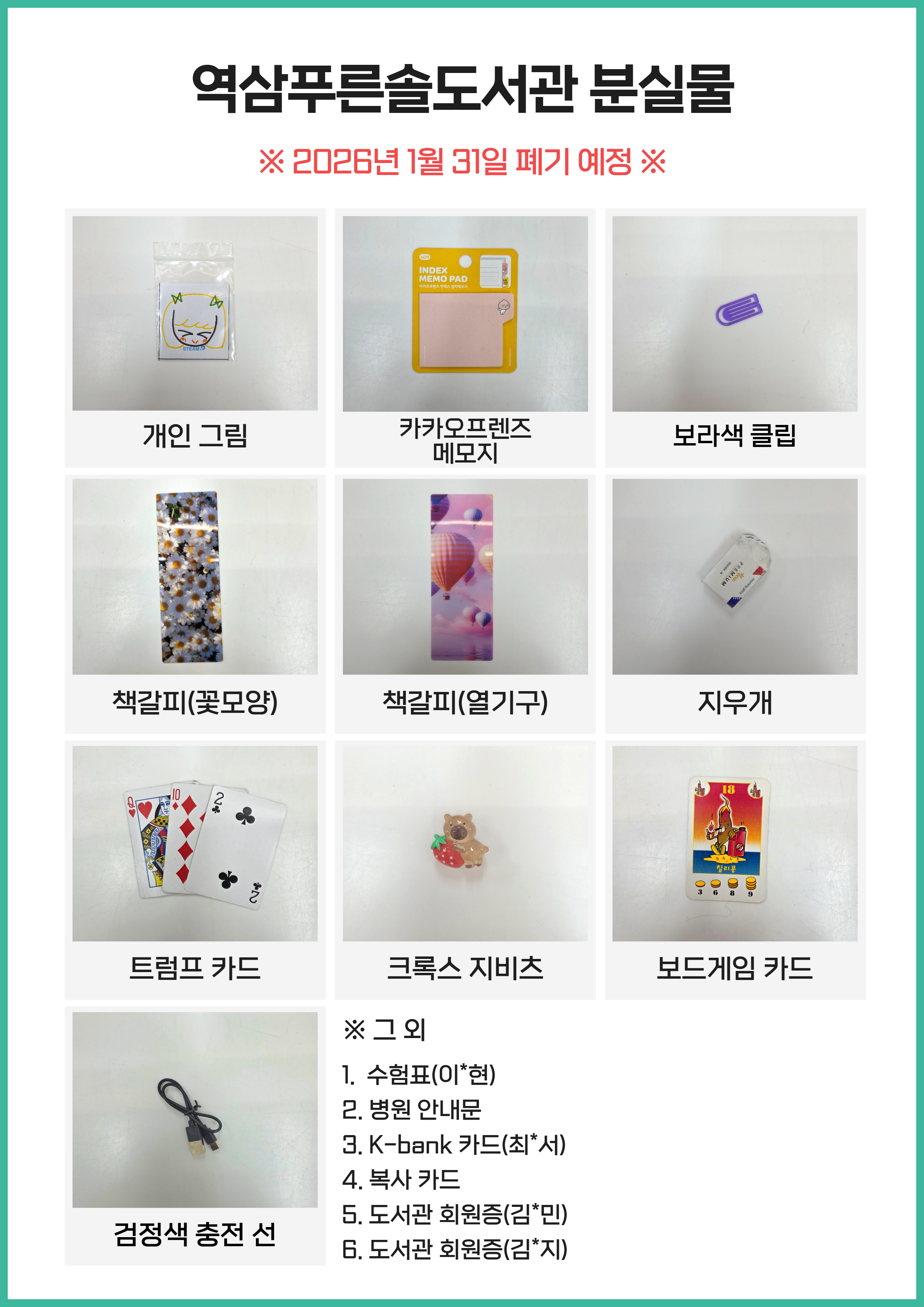 역삼푸른솔도서관에서 아래 분실물들을 보관하고 있습니다.