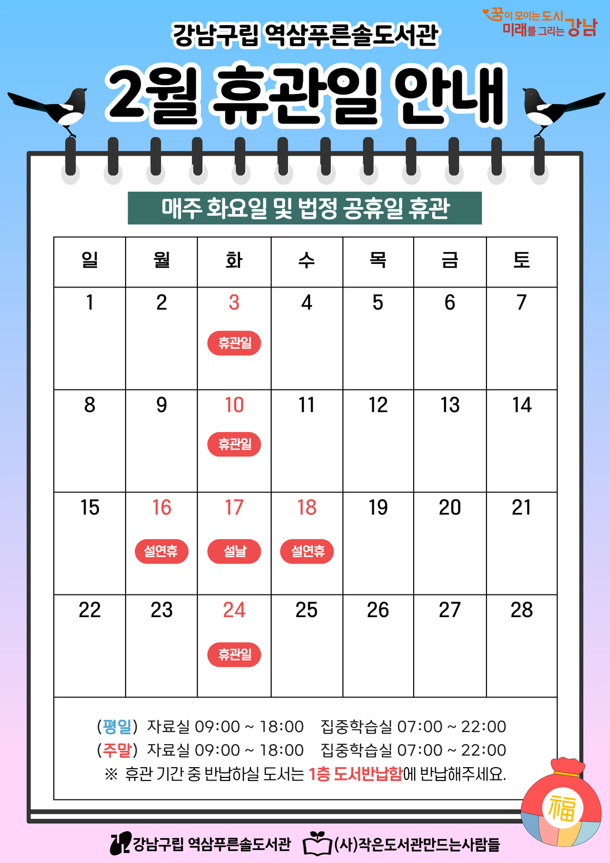 [역삼푸른솔도서관] 2월 휴관일 안내