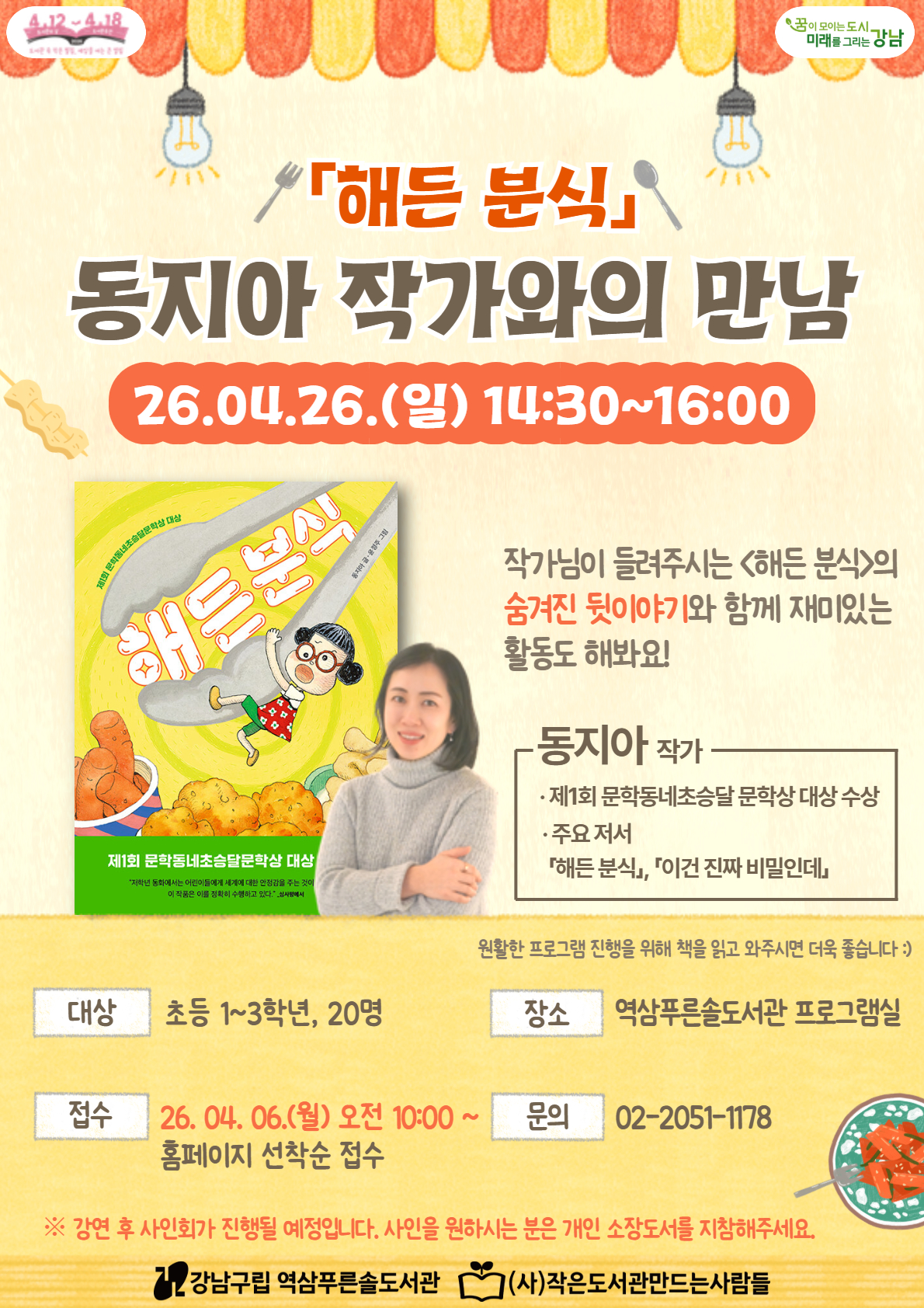 | 행사명 | 역삼푸른솔 [도서관주간] 「해든 분식」 동지아 작가와의 만남 |