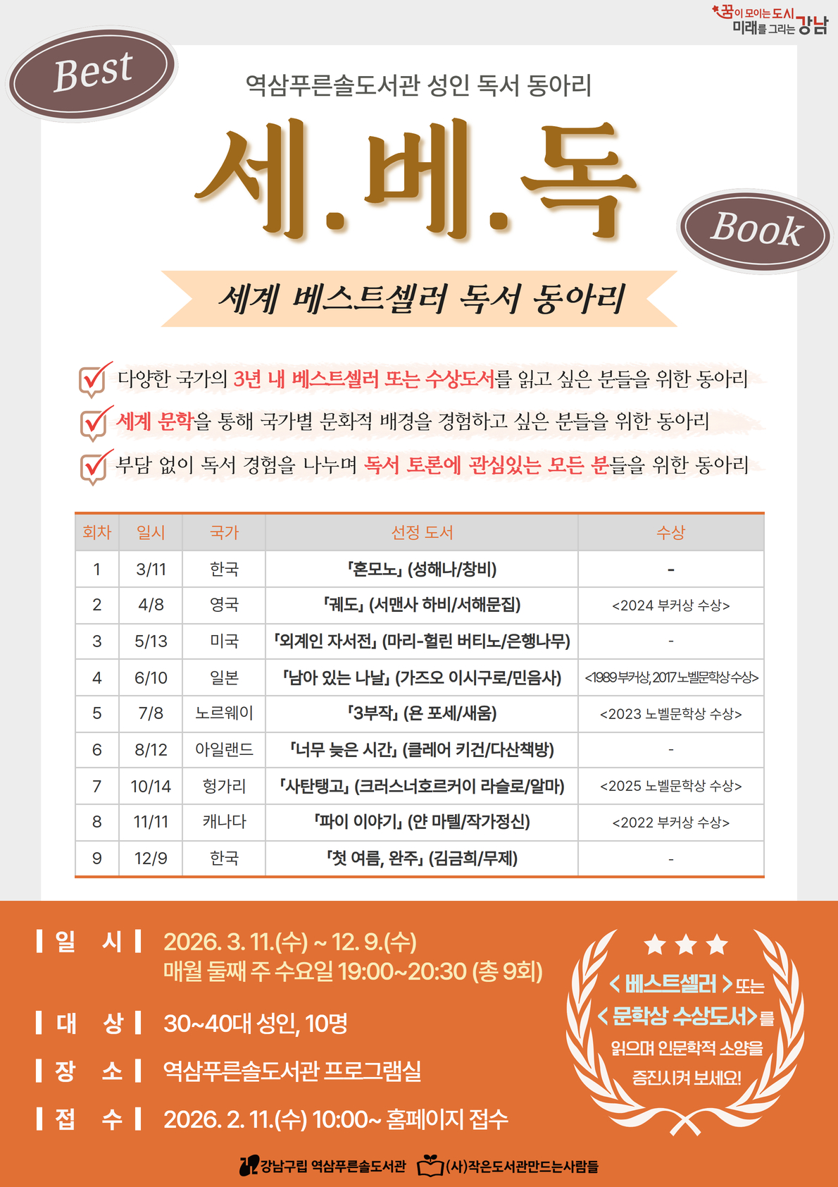 | 행사명 | 역삼푸른솔 [동아리] 성인 세계 베스트셀러 독서 동아리 <세.베.독> |