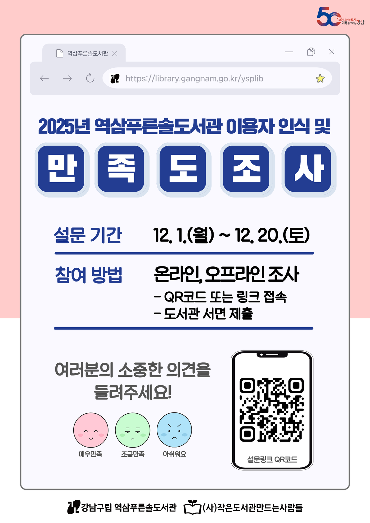 ※ 참여 방법 : 역삼푸른솔도서관 내에 비치된 설문지를 작성해주시거나, 아래 링크 혹은 QR코드로 접속하여 온라인으로도 참여 가능합니다. ※ 설문 링크 : https://forms.gle/XNMD2vsodqLA4W7m7 ![]() |